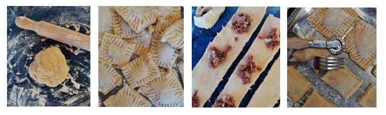 A tésztát kisebb darabokba szedve laposra kinyújtunk egy gyúródeszkán, sodrófa segítségével. Körülbelül 3 centinként felszeljük, hogy egyforma széles, hosszú tésztákat kapjuk, képzeletben kettő felé osztjuk. A töltelék sonkát egyenlő arányban, egyenlő távolságra a tészta egyik felére helyezzük, körbe kenjük kis vízzel, majd a tészta másik felét ráhelyezzük. Óvatosan lenyomkodjuk a tésztánk, hogy összefonódjon a széle, derelyevágóval körbe vágom őket. A kapott raviolink szélét villa segítségével lenyomkodom, így nem csak biztosabb lesz a tapadás, de esztétikailag is szebb lesz. Megismétlem a folyamatot, addig gyúrjuk, szeljük, töltjük, gyúrjuk, szeljük, míg el nem fogy a tészta.
